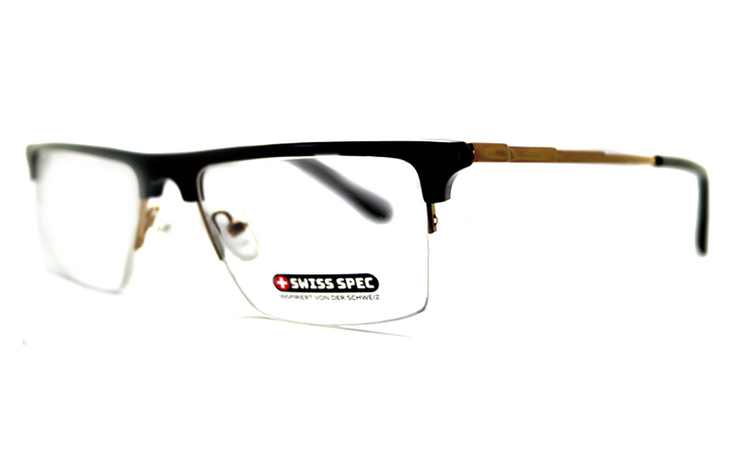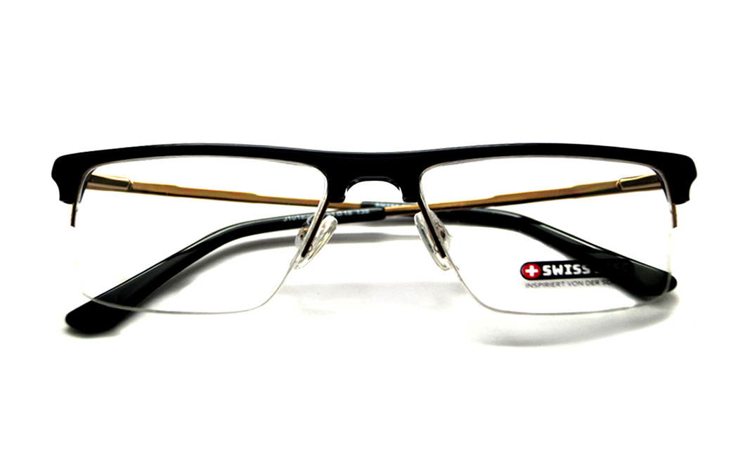 Half rectangular shiny black rim with designed golden metal & black spring side.